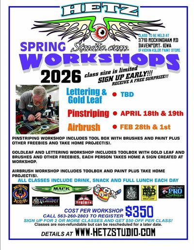 All the classes are held at our Kickin Kolor body shop paint and supplies store 3718 Rockingham Rd. Davenport, Iowa. It has a great class setting with all the room and tools to execute any project. The store will have a lot of materials to purchase at a one time class discount.